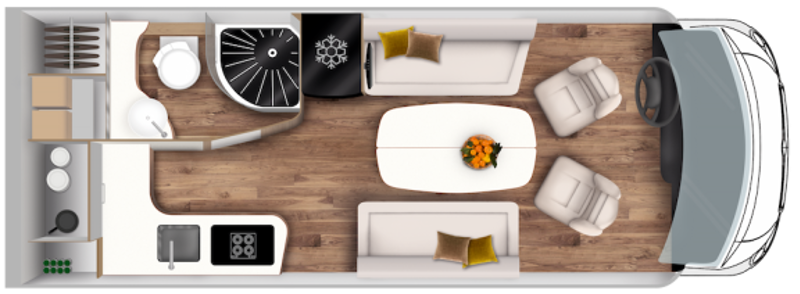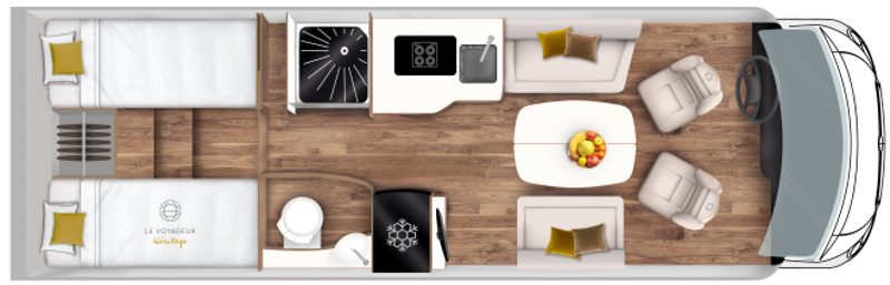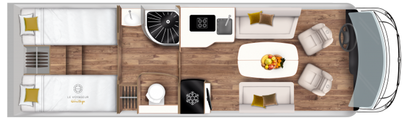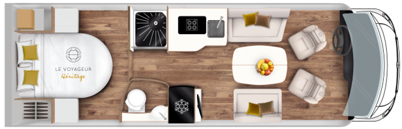 The elegant curves and harmonious lines from the front to the rear of the vehicle lend a dynamic appearance to your Le Voyageur motorhome. The interior design is clean and functional, while the noble materials and the impeccable finish are the hallmarks of a top-of-the-range vehicle.